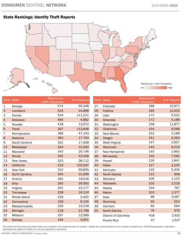 在这些州,你的身份被盗的风险很高