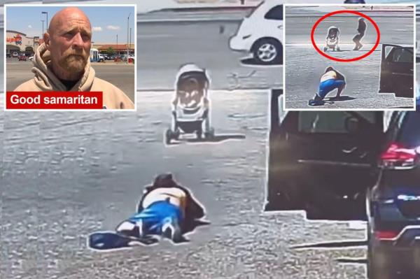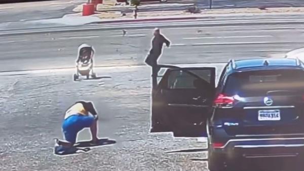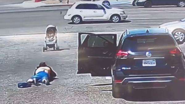 婴儿车里的婴儿在驶入繁忙的高速公路之前停了下来:视频