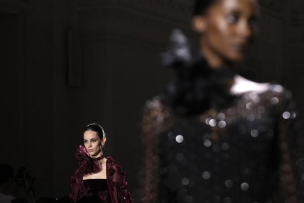 艾莉·萨博(Elie Saab)的经典秋季高级定制有树叶、微光和男士斗篷