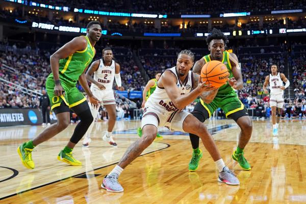 疯狂三月:南卡罗莱纳的塔隆·库珀在半场外击败半场哨音,与俄勒冈保持密切联系