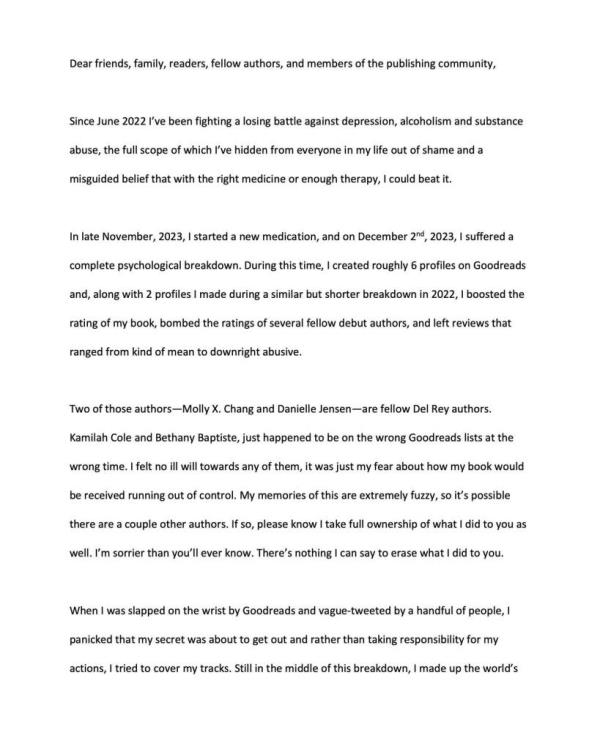 作者在创建假Goodreads账号来抨击非白人作家后道歉