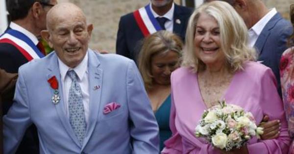 二战老兵在诺曼底登陆日海滩附近迎娶新娘他100岁,她96岁