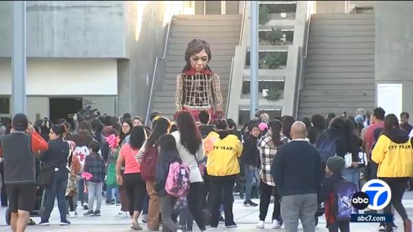 巨大的木偶小阿玛尔访问洛杉矶学校,为年轻的难民带来关注