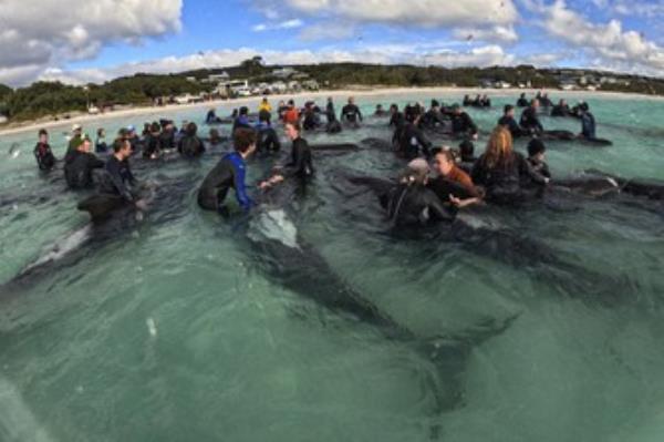 在救援失败后,在澳大利亚海岸搁浅的近100头领航鲸中的最后一头被安乐死