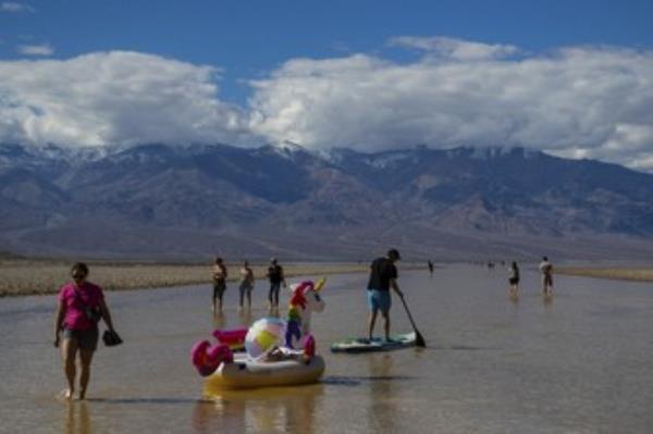 在地球上最干燥的地方之一,皮划艇者在雨水补充湖泊后的死亡谷划桨
