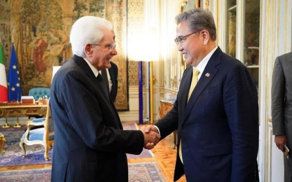 8月1日,意大利总统塞尔吉奥·马塔雷拉(左)在罗马总统府会见韩国外交通商部长官朴振(外交部提供的照片)。韩国联合通讯社