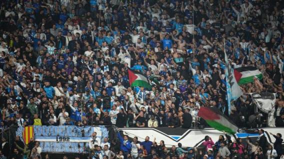 在法甲联赛马赛与里昂的比赛开始前,马赛的支持者在球场内等待。