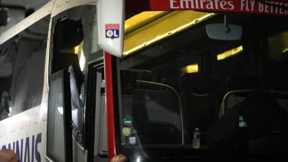 里昂队大巴的窗户被马赛足球流氓投掷的物品砸碎。