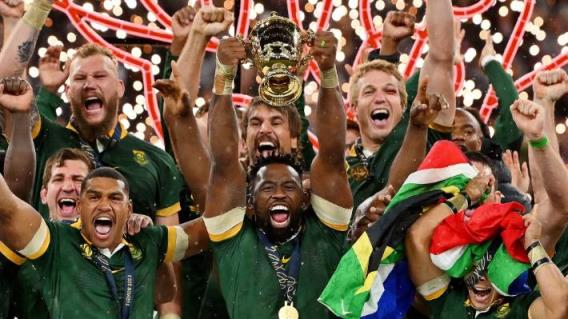 南非政府似乎在嘲笑汤姆·库里的种族主义争端,祝贺跳羚队第四次赢得橄榄球世界杯冠军,并宣布“韦伯·埃利斯(杯)在南非的手中!!”