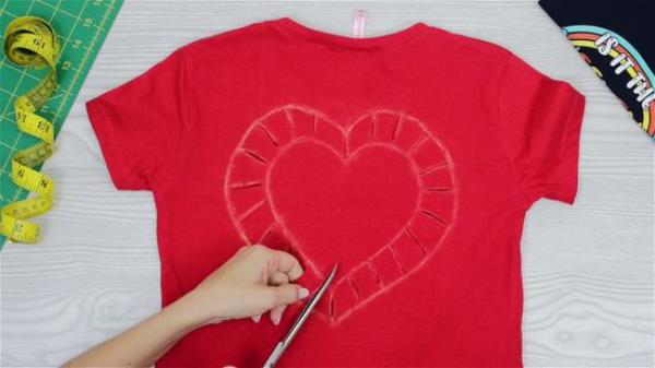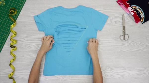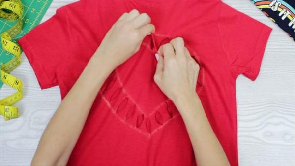 一旦你的衬衫按照你想要的剪裁,穿过衬衫所有的裁剪边缘,轻轻地拉布料。这将使裁剪的边缘卷进衬衫,掩盖任何不平整的地方。狭缝之间的空间也会缩小。你可以拉一下上面和下面的边缘来拉伸这些缝。你也可以把手指滑进去,像剪刀一样把它们打开。