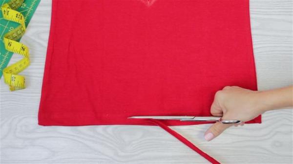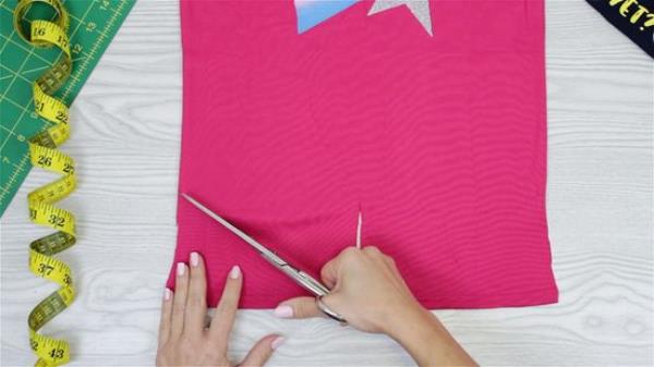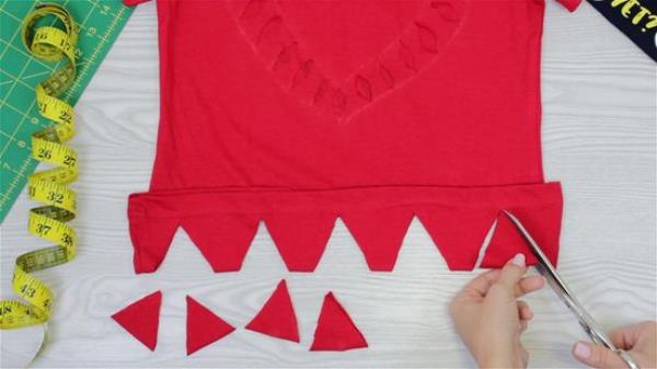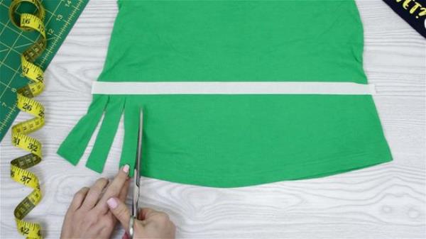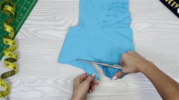 用斜线将狭缝连接到侧缝的切边上。切一个6英寸(15厘米)的垂直缝在V的底部,然后把尾巴打成双结。再进一步,把领子和袖子剪掉。一定要把接缝也剪掉!