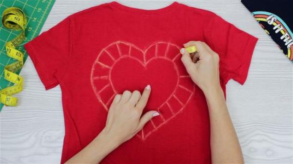 在你的衬衫后面。你想要多大就有多大。深色布料用粉笔画,浅色布料用钢笔画。如果你在衣领上做图案,从衣领向外辐射,画2到3英寸(5.1到7.6厘米)的线。保持一个