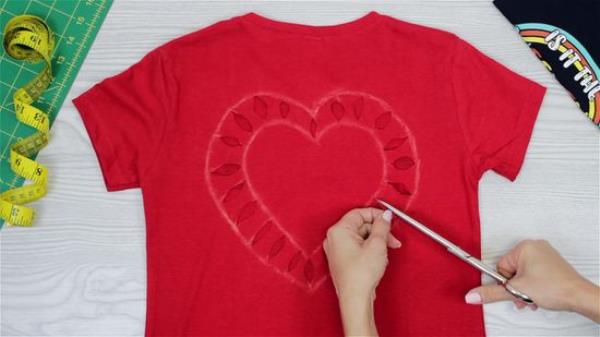 如果需要的话,可以把裂缝加宽成椭圆形或叶子形状。回到你的线条上,把边缘剪掉,让它们更圆,像椭圆形或叶子。确保在每片“叶子”之间留下一些织物。如果你画的是曲线或斜线,你可能想跳过这一步。如果你在领子周围开了个口,就可以这样做。