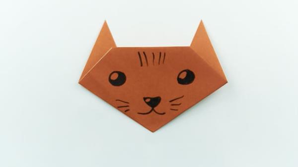把纸翻过来,加上你想要的任何修饰。这一面是猫脸的正面。如果你想让脸型更圆润,把边角稍微往下折。同样,如果你想让猫的下巴变平,而不是