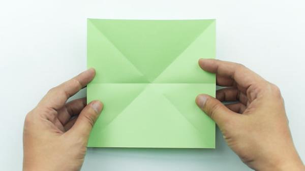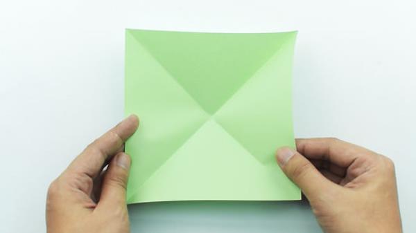 在两条对角线上折叠一张正方形的纸,在中间展开。把两个相对的角放在一起,把对角折痕