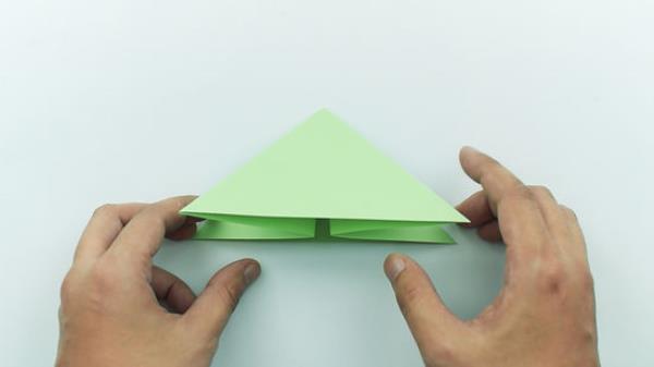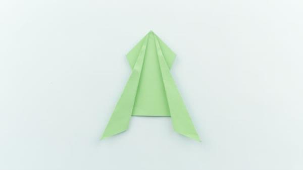 将底部的两个角稍微向外折叠,形成腿。中间的长边现在应该与折叠三角形的外缘对齐。用你的手指紧紧地沿着折痕移动,把它固定在合适的位置。当你做这个折叠时,它有助于把青蛙固定在顶端。