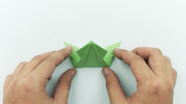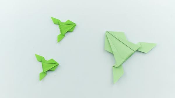 把青蛙的底部折回去把腿往下翻。在靠近底部的地方再折一次,这次把纸折得远离你。这类似于打褶。腿将打开并指向下方,远离头部。在青蛙的顶部加上一双大眼睛,或者用红纸粘在上面