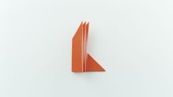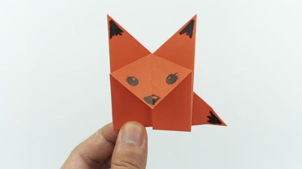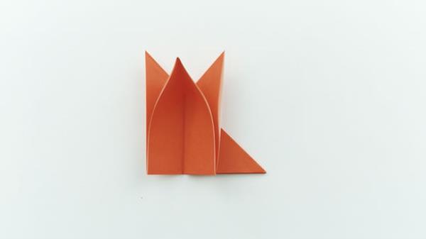 将中间的发梢向下折叠,形成一个头。当你打开盖子时,中间会有一个小的三角形,它会自动开始向下折叠。用你的手指沿着折痕移动,这样它就不会弹回来。如果你想装饰你的狐狸,可以用马克笔、颜料或大眼睛画一张脸。