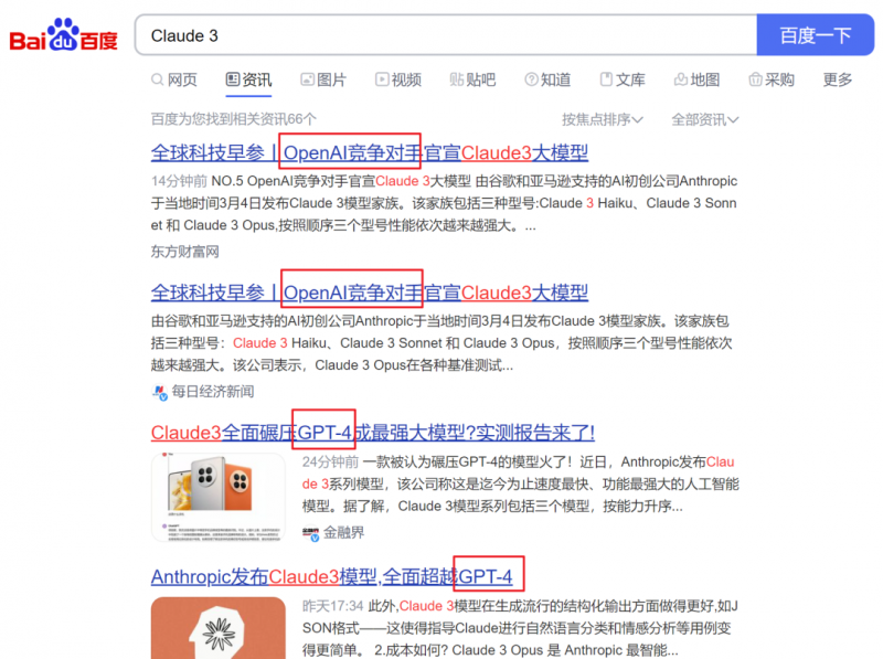 只要是检索与 Claude 3 相关的内容与咨询,几乎逢 Claude 3 必带 OpenAI 或 GPT-4,当然这也是因为 Claude 3 最大的卖点是“击败 GPT-4”,不过对一家公司在市场内的知名度而言,换位思考如果是 OpenAI 发布 GPT-4.5 或是 GPT-5,标题或许绝不可能带 Claude。