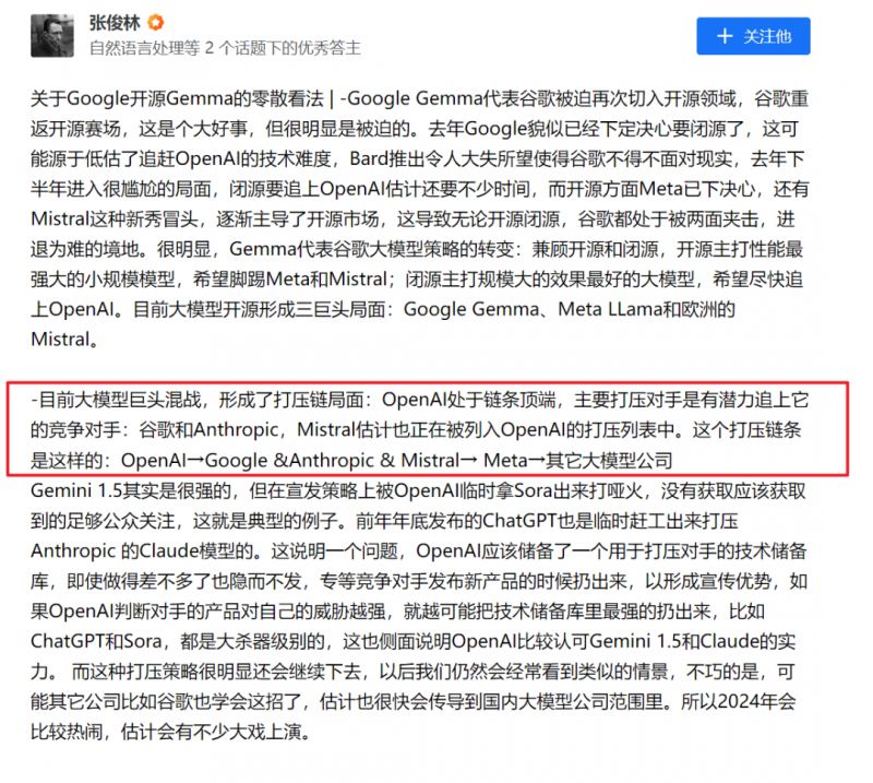 而这种情况被张俊林大佬在前不久总结为“打压链理论”,具体而言在目前整个大模型领域 OpenAI 变成了毫无疑问的“行业老大”,位处链条的最顶端,占据先发优势的 OpenAI “有能力打压有潜力追上它的竞争对手”,比如谷歌再比如 Anthropic。