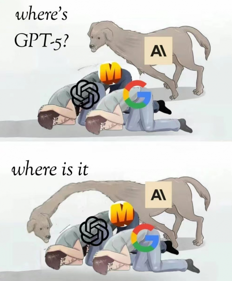 这种策略我们可以在 OpenAI 推出 ChatGPT 打压 Claude 时看到,也可以在今年 Sora 打压 Gemini 时看到,并且在社区内大家甚至也在期待看到 GPT-5 打压 Claude 3 的时刻。不过 24 个小时过去,GPT-5 的王炸暂时还没有出现,这个“where is GPT-5”的表情包也迎来了进化: