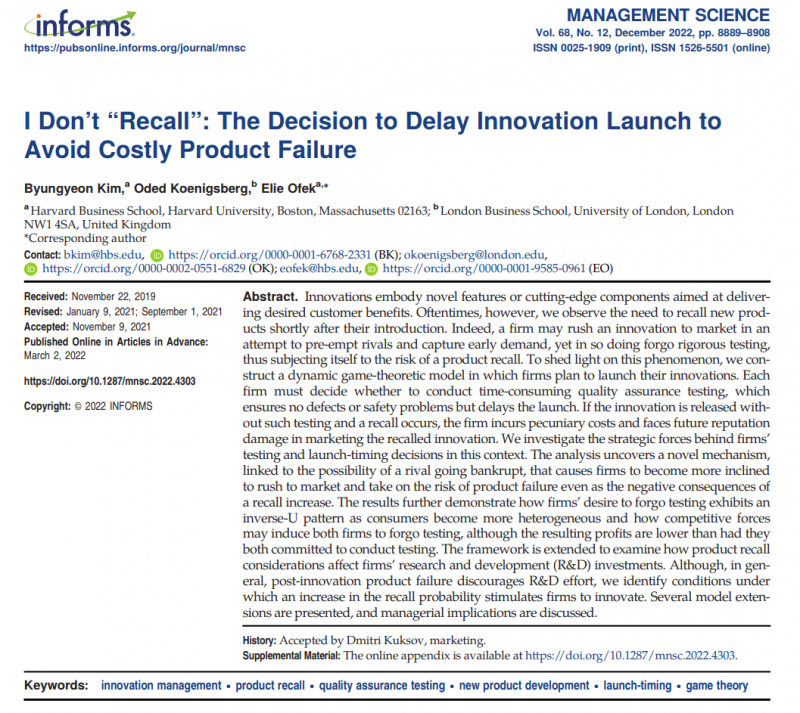 在这个背景下,这篇论文通过一个动态博弈模型发现,即使快速推出产品面临的“召回”风险很高,但是当预计竞争对手也会提前推出创新产品时,最好的做法可能是依然是快速发布抢占先机。因为这种模式更有可能使得竞争对手在“召回”时出现破产,从而获得“赢家通吃”的可能。