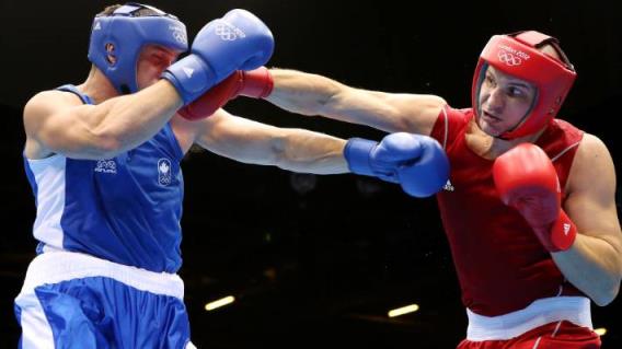 在他们的超级重量级比赛中,加拿大选手西蒙·基恩对哈萨克斯坦选手伊万·戴奇科一拳。